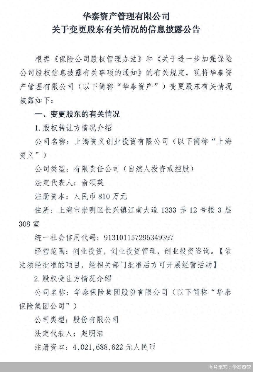北京商报讯(记者 胡永新)6月20日全国前三配资公司,华泰资产管理有限公司(以下简称“华泰资管”)发布公告称,上海资义创业投资有限公司(以下简称“上海资义”)拟将其持有的5460万股(比例9.09%)华泰资管股权转让给华泰保险集团股份有限公司(以下简称“华泰保险集团”)。股权变更后,上海资义不再持有华泰资管股权,华泰保险集团公司持股比例将增至100%。上述变更股东事项待国家金融监督管理总局上海监管局批准后生效。